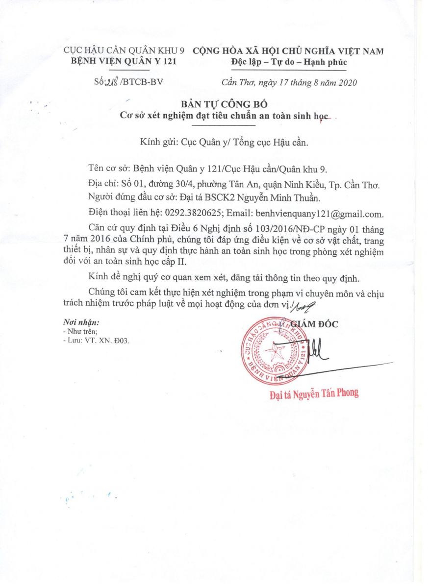Nguồn Tạp chí Y học Quân sự: http://yhqs.vn/thong-tin/333/benh-vien-quan-y-121-cong-bo-co-so-xet-nghiem-dat-tieu-chuan-an-toan-sinh-hoc.htm
